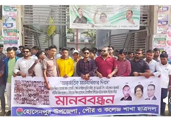 কিশোরগঞ্জের হোসেনপুরে উপজেলা, পৌর এবং কলেজ শাখা ছাত্রদলের মানববন্ধন অনুষ্ঠিত হয়েছে। ১০ শে ডিসেম্বর আন্তর্জাতিক মানবাধিকার দিবস উপলক্ষে হোসেনপুর সরকারি কলেজের সামনে ঘন্টা ব্যাপি এ...