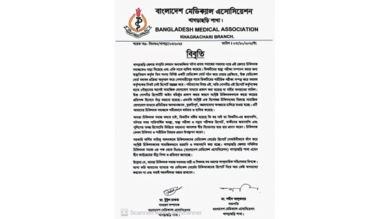 খাগড়াছড়িতে সাম্প্রতিক সহিংস ঘটনাকে কেন্দ্র করে ভিকটিমের স্বাস্থ্য পরীক্ষার গোপনীয় মেডিকেল রিপোর্ট সামাজিক যোগাযোগ মাধ্যমে ফাঁসের ঘটনায় তীব্র নিন্দা জানিয়েছে বাংলাদেশ মেডিক্যাল এসোসিয়েশন (বিএমএ) খাগড়াছড়ি...
