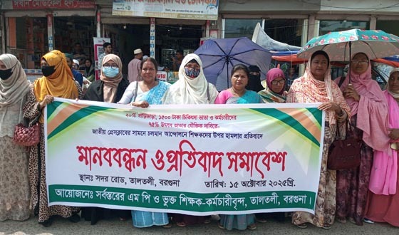 এমপিও ভূক্ত শিক্ষক কর্মচারীদের বাড়ী ভাড়া ২০% সহ ৩দফা দাবীতে চলমান কেন্দ্রীয় ঘোষিত আন্দোলনের ৪র্থ দিনে বরগুনার তালতলীতে মানববন্ধন ও শিক্ষকদের লাঞ্চিত করার প্রতিবাদে প্রতিবাদ...