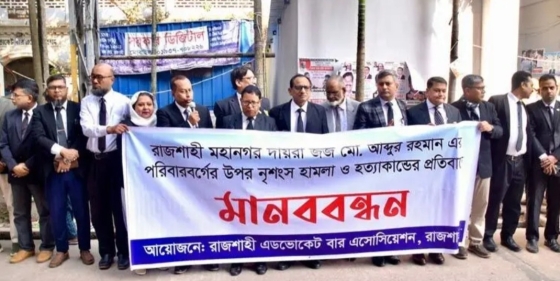 রাজশাহী মহানগর দায়রা জজ মো. আব্দুর রহমানের পরিবারের ওপর নৃশংস হামলা ও তার ছেলে তাওসিফ রহমানকে হত্যার ঘটনায় তীব্র নিন্দা জানিয়ে মানববন্ধন করেছে রাজশাহী অ্যাডভোকেট...