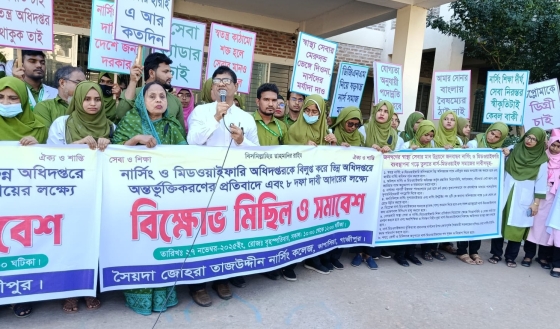 নার্সিং ও মিডওয়াইফারি অধিদপ্তরকে বিলুপ্ত করে অন্য অধিদপ্তরের সঙ্গে একীভূত করার প্রস্তাবের প্রতিবাদে এবং ৮ দফা দাবি বাস্তবায়নের লক্ষ্যে ঢাকা কিশোরগঞ্জ মহাসড়কের কাপাসিয়ায় বিক্ষোভ মিছিল...