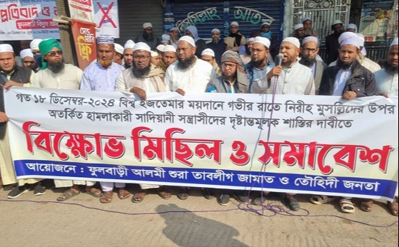 বিশ্ব ইজতেমার ময়দানে মুসল্লিদের ওপর হামলার প্রতিবাদসহ সাদিয়ানীদের শাস্তিসহ তাদের কার্যক্রম বাতিলের দাবিতে আজ বৃহস্পতিবার (২৬ ডিসেম্বর) দিনাজপুরের ফুলবাড়ীতে বিক্ষোভ সমাবেশ ও মানববন্ধন অনুষ্ঠিত হয়েছে।...