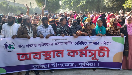 কুমিল্লা এক্সপোর্ট প্রসেসিং জোন (ইপিজেড)-এর ১ নম্বর ফটকের সামনে বকেয়া বেতন-ভাতা পরিশোধ ও পুনরায় কর্মস্থলে ফিরে যাওয়ার দাবিতে বিক্ষোভ মিছিল ও মানববন্ধন করেছেন নাসা গ্রুপের...