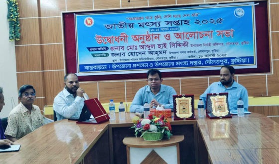 কুষ্টিয়ার দৌলতপুরে উপজেলা প্রশাসন ও মৎস্য দপ্তরের উদ্যোগে জাতীয় মৎস্য সপ্তাহ ২০২৫ এর উদ্বোধন করা হয়েছে। "অভয়াশ্রম গড়ে তুলি, দেশি মাছে দেশ ভরি" এই প্রতিপাদ্যকে...