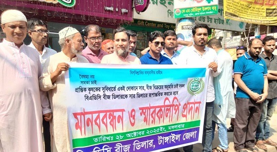 প্রান্তিক কৃষকদের সুবিধার্থে একই দোকানে সার ও বীজ বিক্রয়ের অনুমতি প্রদানের দাবিতে টাঙ্গাইলে মানববন্ধন ও স্মারকলিপি প্রদান করেছেন জেলা বিএডিসি বীজ ডিলাররা।মঙ্গলবার সকালে টাঙ্গাইল প্রেসক্লাবের...