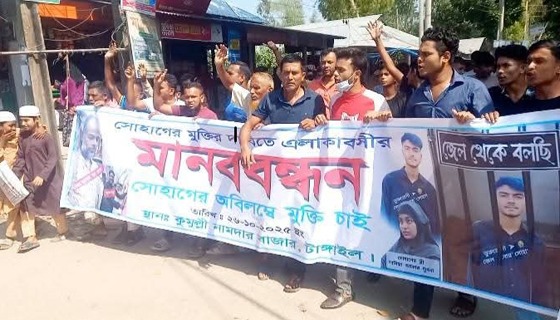 টাঙ্গাইল সদর উপজেলার করটিয়া ইউনিয়নের নামদার কুমিল্লি গ্রামে প্রেমের অভিযোগে কারাগারে থাকা এক যুবকের মুক্তির দাবিতে মানববন্ধন অনুষ্ঠিত হয়েছে।রোববার (২৬ অক্টোবর) সকালে নামদার কুমিল্লি বাজারে...