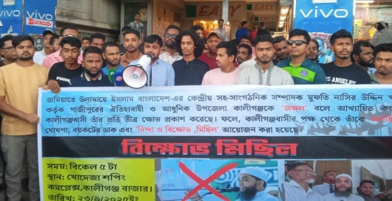 গাজীপুরের কালীগঞ্জ উপজেলাকে “জঙ্গল” এর সাথে তুলনা করে মানহানিকর ও বিদ্রুপাত্মক মন্তব্য করায় আসন্ন জাতীয় সংসদ নির্বাচনে গাজীপুর-২ আসনে জমিয়তে উলামায়ে ইসলাম বাংলাদেশ মনোনীত সংসদ...