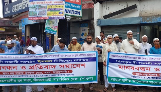হিন্দুত্ববাদী সন্ত্রাসী সংগঠন ইসকন নিষিদ্ধের দাবিতে নীলফামারীতে মানববন্ধন কর্মসূচি পালন করা হয়েছে। ৩১ অক্টোবর নীলফামারী বড় বাজার ট্রাফিক মোড়ে আহলেহাদীছ আন্দোলন বাংলাদেশ ঘন্টাব্যাপী ওই মানববন্ধন...